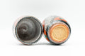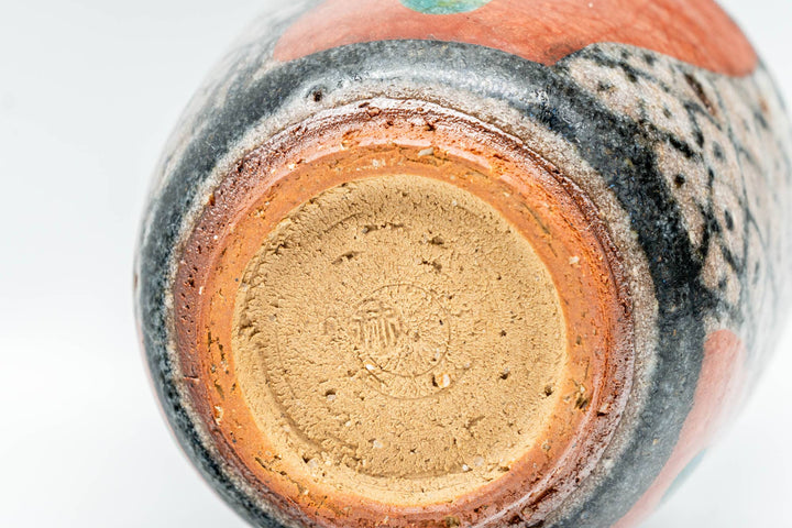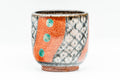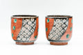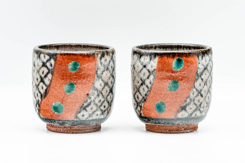 This pair of yunomi (teacups) are decorated with a black checkered pattern with a red stripe and green dots
