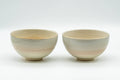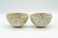 This pair of wide Kyo-yaki yunomi (teacups) feature a soft beige glaze decorated with flowers on its exterior and interior, and gold petals and trim around its lip.