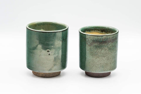 This couple's pair of tsutsu-gata yunomi (teacups) feature a sleek green glaze around the body and a yellow inner glaze.
