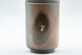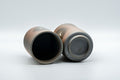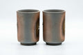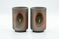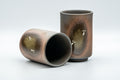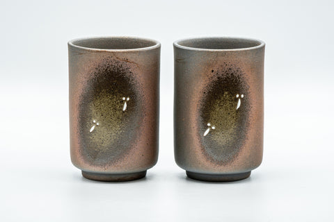 This pair of tsutsu-gata yunomi (teacups) feature patches of dark green ash glaze with geometric designs.
