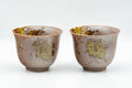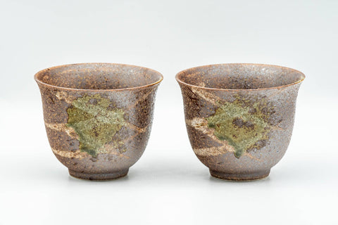 This pair of yunomi (teacups) feature a textured brown exterior decorated with green strokes of criss-crossed glaze.