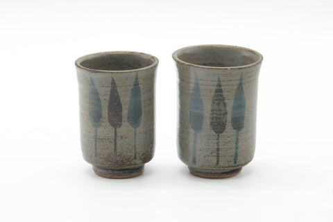 This pair of meoto yunomi (large and smaller teacup) feature a grey glaze decorated with cute trees.