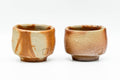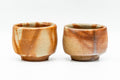 This pair of light brown and orange Bizen-yaki guinomi (small teacups) is decorated with the hidasuki (緋襷) pattern. This traditional decoration is created when the potter wraps rice straw around a piece before placing it into the kiln, where the alkalines in the straw react with iron in the clay body to produce these striking scarlet burn marks.