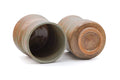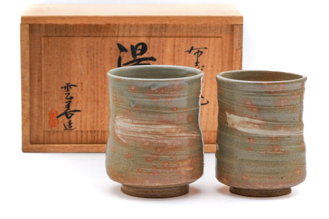 This pair of meoto Hagi yunomi (couple's teacups) feature a dark beige glaze decorated with pink gohonte spots and an abstract hakame brush stroke. Ships in original tomobako (wooden paulownia box).