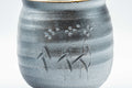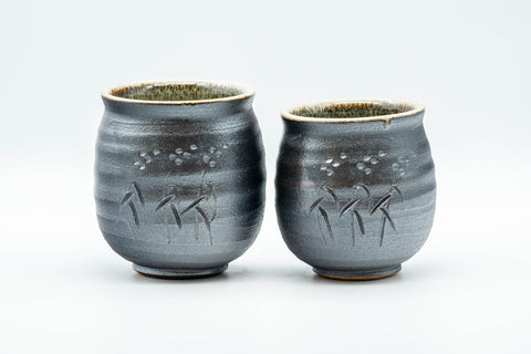 This couple's pair of yunomi (teacups) feature a rounded shape with ridges and are glazed in a metallic grey on the outside and a mottled green on the inside.