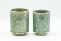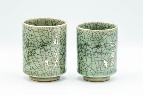This couples' pair of Obori Soma-yaki yunomi (teacups) feature an elegant celadon glaze decorated with hand-painted horse motifs. Called 'meoto yumomi' in Japanese, couple's pairs of teacups are traditional wedding gifts.