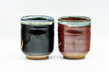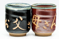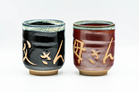 This pair of tsutsu-gata yunomi (teacups) feature a black glazed exterior decorated with kanji that read 'otousan': dad, a beige interior, and a beige hare's fur glaze around the lip. The red yunomi is decorated with kanji that reads 'mom".