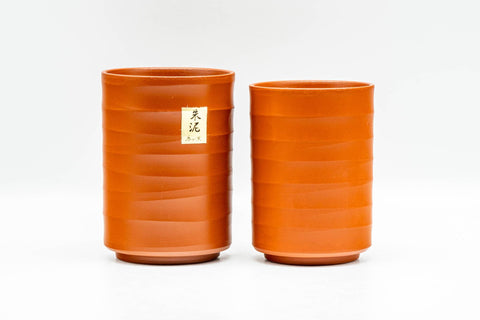This pair of tsutsu-gata Tokoname-yaki meoto yunomi (teacups) feature spiraling red shudei clay exteriors.