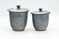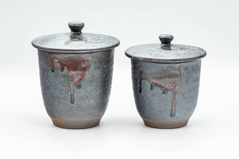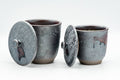 This pair of lidded meoto yunomi (teacups) feature a stunning black drip-tenmoku glaze. The cup's lid helps keep dust out and heat in.