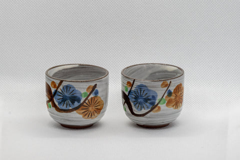 A pair of guinomi (small cups) with a brushed white glaze and painted orange and blue flowers