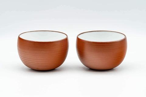 This pair of Tokoname-yaki yunomi (teacups) feature a horizontal striped clay textured exterior and a white glazed interior.