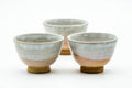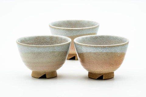This set of three Hagi-yaki yunomi (teacups) feature a beige and white weathered glaze.