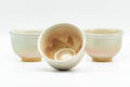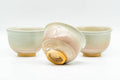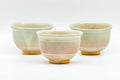 This set of three Hagi-yaki guinomi (small teacups) feature a lovely milky beige and pink glaze over spiraling exterior patterns.