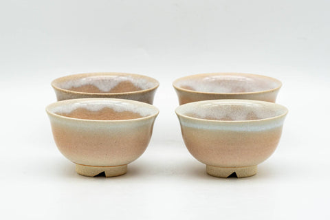 This set of four Hagi-yaki guinomi (very small teacups) feature a beige and white drip-glaze. Made by Tsubaki Kiln 椿窯, 天鵬山.