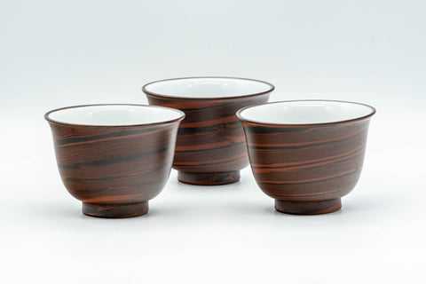 This set of three Tokoname-yaki yunomi (teacups) is made from striking red marbled clay and features white glazed interiors, which showcase the true colour of the tea liquor. The marbled effect is produced through the nerikomi technique, which involves layering different coloured clay. Made by Shintsuki (伸月).