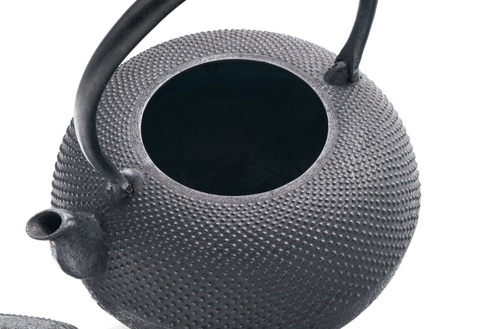 Kunzan KōbōThis handcrafted tetsubin (鉄瓶 - cast iron kettle) is cast from Japanese iron in the classic round shape, decorated with the traditional surface pattern of small bumps called arare (霰 - hailstones). Holding 1.2 litres (40 oz.), this kettle is ideal for solo or group tea sessions.