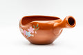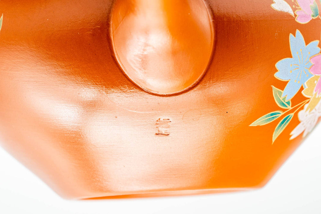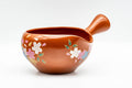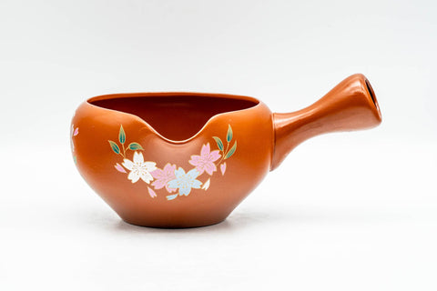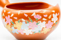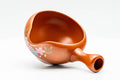 This red shudei Tokoname-yaki yuzamashi (water cooler) is decorated with floral motifs. It's perfect for adjusting water temperature when brewing high quality Japanese tea.