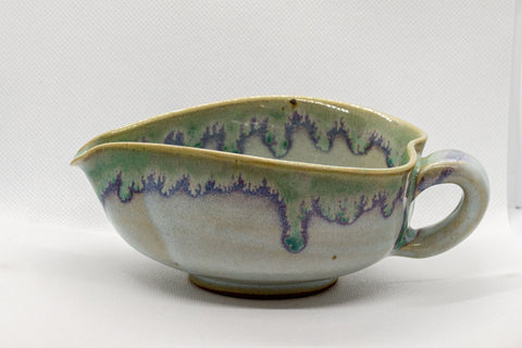 Vintage grey ushirode (rear-handle) yuzamashi (water cooler) with a green and purple drip glaze. Perfect to adjust water temperature when brewing high quality Japanese tea.